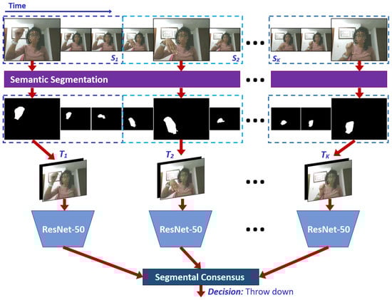 The original proposal of TSN presents a two-stream CNN combining the consensus of RGB-based and OF-based networks. In our proposal, instead, we propose to exclude the two-stream approach by using a single CNN based on an RGB-S input, as shown in Figure 3. In this paper, we used ResNet-50 [] as the main 2D-CNN architecture of TSN. Formally, given a video V, we divide it into K segments () of an equal number of frames. Then, the FASSD-Net is used to obtain segmentation masks of each frame to define the multimodal RGB-S input. Finally, the TSN applied to a sequence of short clips is defined as follows: