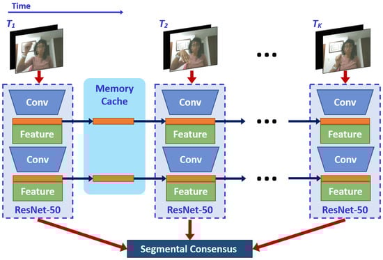 Following its original implementation [], we insert TSM on the TSN framework, enabling temporal information fusion at no computation. So that, a 3D-CNN process is emulated by inserting a temporal shift module on each convolution block, enlarging the temporal receptive field as if running a convolution along the temporal dimension. The TSM-based network learns the parameters using a sequence of short clips as described in Equation (1). Furthermore, to fulfill the online requirements, for each frame, the first 1/8 feature maps of each residual block of ResNet-50 [], are stored in the memory cache. Subsequently, the first 1/8 feature maps of the next frame are replaced with those previously stored. In resume, the combination of 7/8 current, and 1/8 old feature maps are used to generate each convolutional layer. Figure 4 shows the diagram of our TSM-based network, where we further increase the feature extraction capability by providing the hand segmentation masks at the data-level.