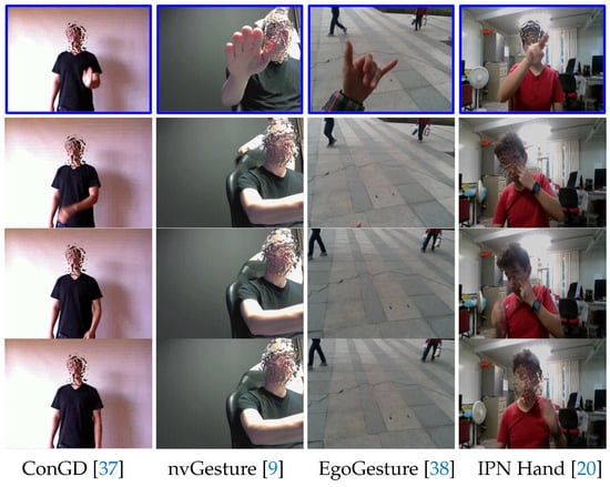In this paper, we used the new IPN Hand dataset [], which includes more than 5000 instances of static and dynamic gestures designed for the interaction with touchless screens. In particular, it includes gestures to control the pointer’s location on the screen (pointing), and to manipulate interfaces (actions): for the former, two static gestures of pointing with one and two fingers are included (Point-1f & Point-2f); for the latter, 11 gestures are defined, including click with one and two fingers (Click-1f & Click-2f), throw to four positions (Th-up, Th-down, Th-left & Th-right), open the hand twice (Open-2), double click with one and two fingers (2click-1f & 2click-2f), zoom-in, and zoom-out (Zoom-in & Zoom-o), as shown in Figure 5. Segments where natural hand movements are performed between target classes, are defined as non-gestures states (No-gest). Non-gesture segments represent the largest number of instances in the dataset (1431). On the other hand, pointing classes include around 1000 instances each, while action classes 200 per gesture. It is worth noting that, the IPN Hand dataset presents a more realistic and challenging situation compared to common datasets due to the nature of non-gesture states, which show natural hand movements similar to some of the target gestures. Figure 6 compares gesture vs. non-gesture states between the IPN Hand and commonly used hand gesture datasets, such as ConGD [], nvGesture [], and EgoGesture []. As we can see, the non-gesture states of the IPN Hand dataset are significantly more challenging to exclude compared to other datasets, which makes an excellent evaluation point for HGR models.