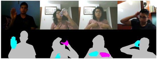 Example of the pixel-level annotations on non-gesture frames. Top row: original RGB frames. Bottom row: pixel-level annotations, gray=person, cyan=right, magenta=left hand.