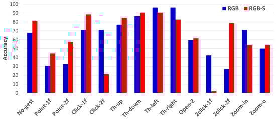 To clearly show the improvement achieved of RGB-S, Figure 8 presents per-class accuracy with both input modalities. Not all the classes are improved at the same rate, and some are even better when using only RGB. The most significant improvement is achieved for the pointing classes and the non-gesture, while classes of throw right and zoom-in are clearly better when using the RGB modality. Interestingly, the results of clicking gestures present contrasting results for the two modalities. Click with one finger, and double click with two fingers are easily classified when using RGB-S, while RGB achieves the opposite situation. Nonetheless, the results of RGB are more stable in these classes. In general, the average accuracy per class for each modality is 62.8%, 63.6% for RGB and RGB-S, respectively. Note that these results are different from the accuracy performance shown in Table 2 due to the samples’ imbalance for each class. As mentioned before, non-gesture and pointing classes have considerably more samples than the action classes. Therefore, we separate the evaluation results of the IPN Hand dataset into two setups: when classifying the complete dataset (13 classes plus non-gesture clips); and when using the 11 action classes only.