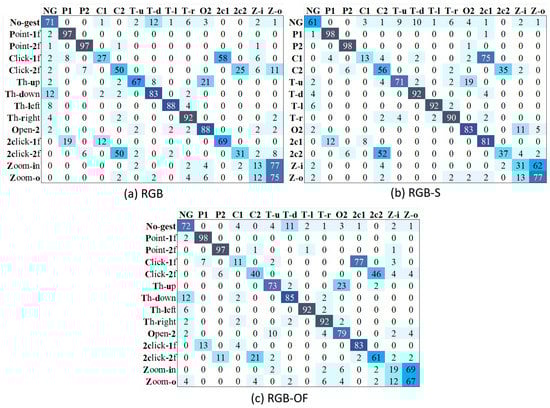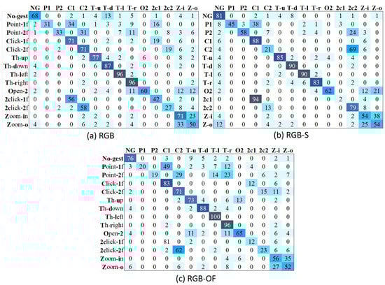 Figure 11 shows the confusion matrices of TSM and TSN methods with RGB and RGB-S modalities. We can see that our proposed RGB-S helps to solve problems related to a similar appearance in hand shapes such as Open-2→Zoom-in for TSM, and Zoom-o→Zoom-in for TSN. However, both methods present evident problems to distinguish between clicking and double-clicking classes, a problem not solved even with multimodal inputs. We speculate the reason is that repetitive gestures such as open twice and double-clicking, may need a longer time span to be evaluated correctly. In order words, 32 frames may not be enough to cover the main activity of these classes.