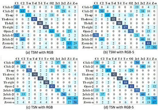 On the other hand, the problem of repetitive gestures mentioned in Section 4.6 may worsen the performance of TSM. To prove that, we estimate the results of a short action class set by excluding the repetitive gestures (Open-2, 2click-1f & 2click-2f). Figure 12 shows the confusion matrices of both methods using our RGB-S proposal. As expected, the results of TSM are higher than those of TSN, with an average accuracy of 85.1% and 82.9% for TSM and TSN, respectively. In this figure, we can see that the problems of TSM for recognizing clicking gestures are solved. Besides, the TSM can handle better than TSN the similar appearance problems related to zoom-in and zoom-out gestures. In this way, we can conclude that TSM performs better for gestures that rely more on temporal information, while TSN achieves good for static hand gestures.
