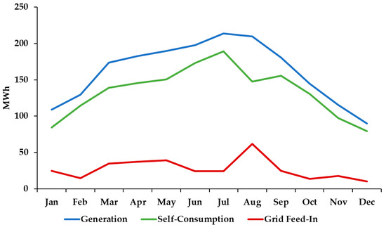 Figure 5 presents the variation of the PV generation, self-consumption, and grid feed-in throughout the year. As expected, the generation is higher during summer, leading to higher self-consumption levels. Regarding the grid feed-in, there is a high increase in August due to the low demand and high generation level.