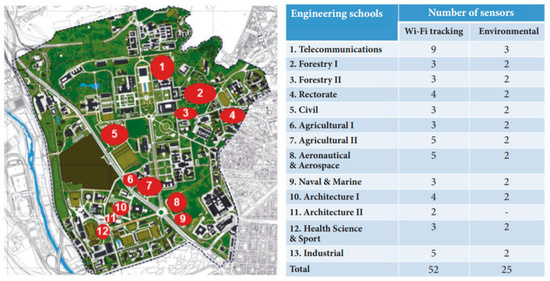 As is shown in Figure 6, the Smart CEI Moncloa currently includes 52 Wi-Fi sensors (nine of them deployed in the ETSIT-UPM) and 25 environmental sensors (three of them deployed in the ETSIT-UPM). The Smart CEI Moncloa has been used and further developed in a remarkable number of BSc and MSc theses, as well as in research works. Among the latter, it is worth mentioning that, where the huge amount of data are stored from the Wi-Fi tracking devices of the ETSIT-UPM during a whole year, this information is used for analyzing time and occupancy, the position of people, and the identification of common behaviors [31].