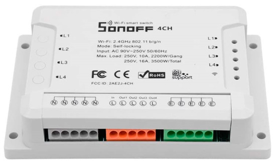 Figure 9. Sonoff Pow R2. - Sonoff 4CH: This sensor (Figure 10) is useful for deployment inside equipment racks because it supports DIN (Deutsches Institut für Normung) rail mounts as well as four independent control channels from one electrical input, and supports a maximum current per line of 10 A (2200 Watts) and a maximum of 16 A (3.5 kW) for the four lines.
