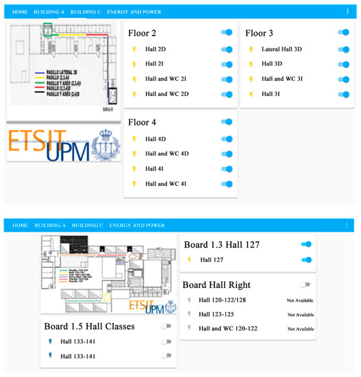 From the energy efficiency point-of-view, the control and monitoring of loads are also crucial. As can be seen in Figure 4, the building presents a high baseload which indicates that a large number of loads are permanently in operation, even when not needed. Therefore, it is important to individually monitor the main loads, to remotely identify when they are used or not to contribute to more effective management. Additionally, the remote control of such loads can ensure that they are turned off in the periods when they are not supposed to operate. For this objective, the most important loads are lighting and HVAC, which typically ensure more than 65% of the electricity consumption in this type of buildings [11]. It is crucial to install technology to enable the individual monitoring of such loads, as well as to its remote control to achieve energy savings and enable its control to ensure a higher matching between local generation and demand, take advantage of periods with lower tariffs, and in the future even provide demand response services to the grid. Therefore, a new IoT platform to ensure such monitoring and control was developed, as presented in Section 5.