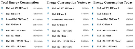 As the central brain of the control and monitoring platform, home assistant [44] was used, with it being connected to the broker for receiving information from sensors by using the MQTT protocol, as well as real users throughout a web-based interface to manage the electrical monitoring platform. The home assistant was installed in Raspberry 4 hardware [45]. As a result of all this integration, the system was developed, as shown in Figure 13, in which the lighting of building B and partially from building A were monitored and controlled. Despite using current technologies, the proposed solution ensures a global architecture that ensures the interoperability between different options of sensors and controllers, and integrates data from different sources in a reliable and cost-effective way. Additionally, the developed platform enables the implementation of novel energy services that are not possible with the current technologies available on the market.