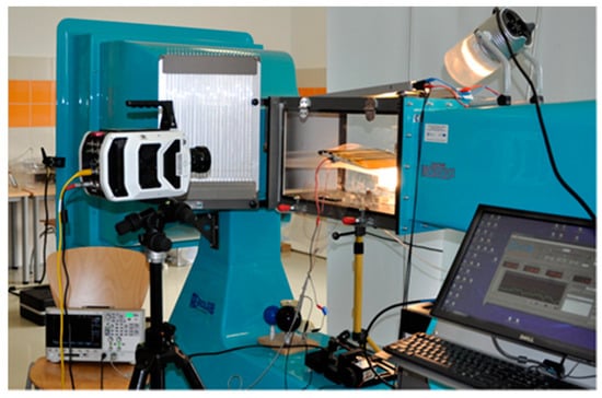 The HV electrode is 200 mm long and 10 mm wide and is placed on the dielectric surface at a distance of 15 mm from the leading edge. Both mesh electrodes are made of AISI 304 stainless steel, it prevents oxidation of the electrode surface by ozone generated during DBD, the mesh size of the electrodes was 0.05 mm × 0.05 mm. The electrodes are connected to a high voltage power system with a value of several kV. The wing model was placed in the AeroLab wind tunnel (Aerolab LLC, Jessup, USA), which allows to control the air speed in the range of V = 4.5–65 m/s and measure the forces acting on the wing during experimental tests. The measuring stand and the wind tunnel are shown in Figure 2.