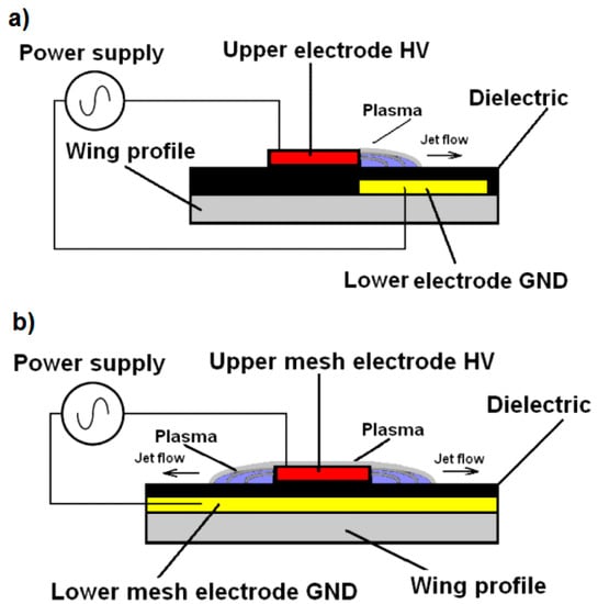 Comparison of the design of plasma actuators: (a) classic with solid electrodes and, (b) with two mesh electrodes.