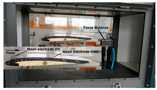 Experimental research was carried out with the wing model with the SD 7003 profile, 250 mm wide and 250 mm long. The wing model is made of fiberglass, balsa and plywood. Two mesh electrodes are placed on the upper surface of the wing as shown in Figure 1. A large, grounded mesh electrode is 200 mm long and 200 mm wide is full covered with four layers of Kapton dielectric and is attached directly to the wing surface. The use of a dielectric to prevent spark discharges and high local temperature increase [30,31].