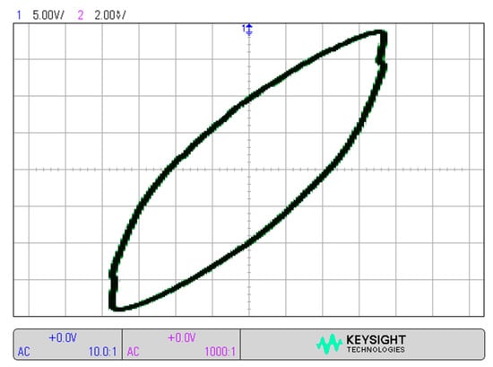 During the experimental research, use of the oscilloscope allowed for the recording of Lissajous figures with which the power of the discharges was calculated. Figure 7 shows an exemplary Lissajous figure for the discharge power of 1.0 W. The power of the discharges during the experimental research ranged of P = 1.0–2.2 W, with the supply voltage of Vp = 7.5–15 kV. High voltage power supply with a frequency of 50 Hz was used to power the DBD plasma actuator.