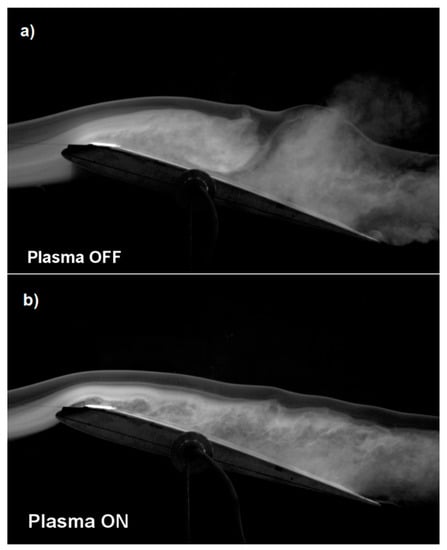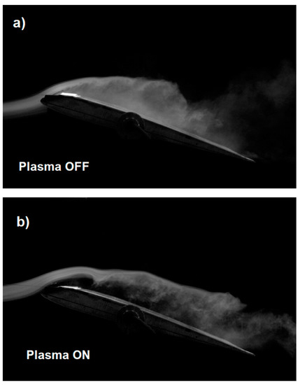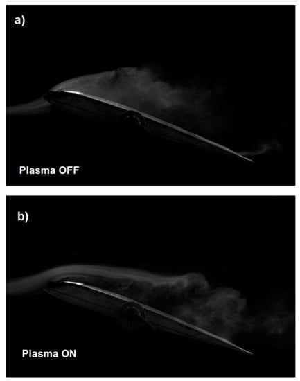 In addition to the results presented in Table 1, the effectiveness of the plasma actuator is also confirmed by photos taken with a high-speed camera. The use of a smoke generator and high-speed camera allows to observe the air flow for the system with the plasma actuator turn on and turn off. The photos show the influence of the DBD system on the change of air flow over the upper surface of the wing. Turning on the plasma actuator allows for a more laminar airflow as shown in Figure 8b. During the experiment, the camera recorded photos at 3000 frames per second, which provided high quality photos.