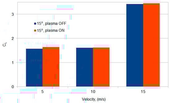 The lift coefficient CL was used to determine the lift force changes depending on the air flow velocity and the angle of attack. Figure 11 shows the change in the lift coefficient CL of the wing model with the plasma actuator turn off and turn on. The changes in the lift coefficient presented in Table 3 are most visible on the graph for the flow velocity in the range of V = 5–10 m/s, when the air flow velocity is low.