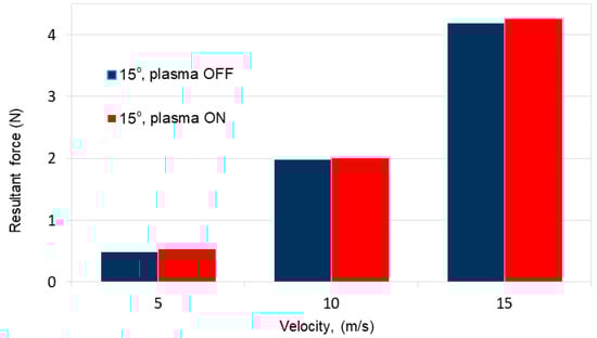 Changes in the resultant force trend depending on air flow velocity in the range of 5–15 m/s and angle of attack 15°.