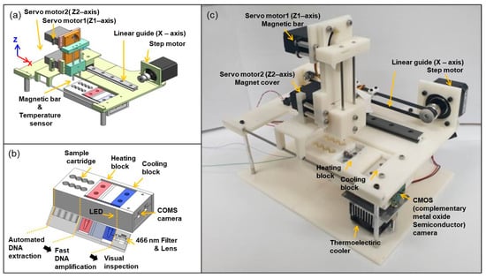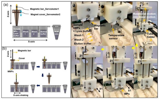 The DNA from targets is usually extracted in several steps, including lysis, capture, separation, and purification. Commercialized automation systems have been implemented clinically, but are expensive, complex, and too large for application in POC testing [8,9,10]. Therefore, DNA extraction for a POC test is still performed manually. However, the process is labor-intensive due to the large number of pipetting steps, and is therefore slow and subject to human error [11,12]. To solve these problems, many attempts have been made to assemble low-cost, portable, automated systems from 3D-printed parts, off-the-shelf electronics, and smartphones [13,14,15,16,17]. However, POC testing requires an integrated system for practical use.