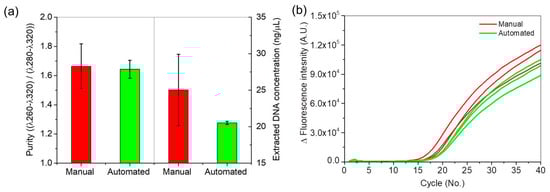 (a) DNA purity and concentration of manual and automated extraction samples, and (b) variations in fluorescence intensity of manual and automated extraction samples during PCR amplification.