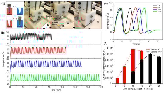 (a) Schematic image and photographs of each step to generate rapid thermal ramp cycles by heating exchangers transporting conical PCR microtubes between heating and cooling blocks. (b) Temperatures during thermocycling for fast PCR amplification when the annealing/elongation time was 1 s (black line), 5 s (red line), 10 s (blue line), and 15 s (green line), (c) temperatures of two thermal cycles depending on annealing/elongation time for enlargement. (d) Optimization of annealing/elongation time for fast PCR (red bar) and general PCR (black bar).