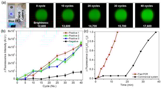(a) Photographs of fluorescence optical setup and captured fluorescence images during PCR amplification every fifth cycle. Fluorescence images change from dark green to light green during PCR amplification. Numbers on fluorescence images are calculated brightnesses. (b) Variations in brightness of positive and negative samples with respect to cycles. (c) Relative fluorescence intensity ((ΔI − I(0))/(I(max) − I(0)) with respect to amplification time for the fast PCR system (red) and the commercial PCR device (black).