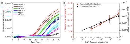 (a) Real-time fluorescence curves of 10-fold serial dilution samples (10−1 to 10−5, 8 to 0.0008 ng/ µL) from the commercial PCR device. (b) Variations in fluorescence intensity at 40 cycles from the automated fast PCR system and commercial PCR device.