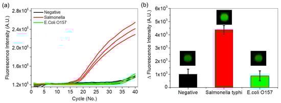 (a) Real-time PCR curves for Salmonella (red lines), E. coli O157 (green lines), and negative samples (black lines) using the commercial PCR device, and (b) variations in fluorescence intensity and images during the same Salmonella PCR assay using the automated fast PCR system.