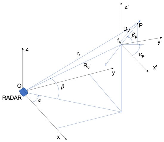 In Figure 1, the geometry used to analyse the micro-Doppler induced by a point-target P, vibrating with frequency at distances from the radar and from the center of coordinates , is shown [30]. The list of used symbols and their meanings is reported in Table 1. Using a simplified model in the slow-time domain, the radar received signal can be expressed as