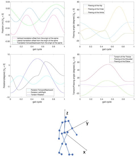 This simplified model could be generalized to more complex scenarios. However, it is worth noticing that an object or any structural object’s component may have oscillatory motion, which can be referred to as micro-motion, including any oscillatory motion in addition to the bulk motion of the object. For the case at hand, human articulated motion is composed by a superposition of different motions of the human body parts. A global human walk model based on empirical mathematical parameterizations has been derived in [31]. Specifically, the motion is described by 12 trajectories, 3 translations, and 14 rotations, five of which are duplicated for both sides of the body, as shown in Figure 2.