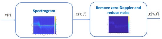 The main steps for a data analysis using a radar for gait MD feature extraction are shown in Figure 4. The first step consists in collecting data from the radar and processing it calculating the spectogram. In the next step, MD signatures are pre-processed through clutter and noise reduction.