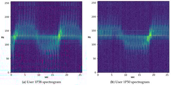 Figure 5 shows the spectrograms of a 25.5 s window of two users given as input to the TCN network. As can be seen from the figure, identifying the distinctive features of the spectrogram that belong to a given user is not a simple task, surely for a human but even by means of classic machine learning approaches (e.g., decision trees or support vector machines). To learn the patterns and dynamics of the detected walkers, larger neural networks are needed, since they are capable of extracting complex features by recombining and processing them using larger numbers of layers. Our decision to use TCN is based on the fact that this kind of neural network is characterized by causalness in the convolution architecture design making it suitable to our classification problem where the relationships among the spectrogram sequences and the walking target should be learned. However, the proposed variant also includes a two-stage attention layer structure allowing to better capture both lower and higher dynamics that characterize micro-doppler signatures.