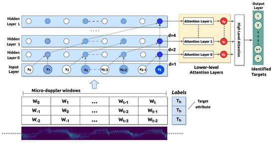 Figure 6 depicts the classification process realized in this study. The figure shows a TCN classifier trained by a set of micro-doppler time windows W. These windows are extracted from the spectrograms, like those shown in Figure 5, and used for neural networks training process. Each set of windows (represented by a row of the table in the lower part of the figure) is computed as a feature vector representing a single instance associated with a multinomial label , which specifies the person identity (target attribute). The spectrograms sliding windows are given as input to the network and are propagated through the layers of the TCN with a dilation factor that doubles on each layer.