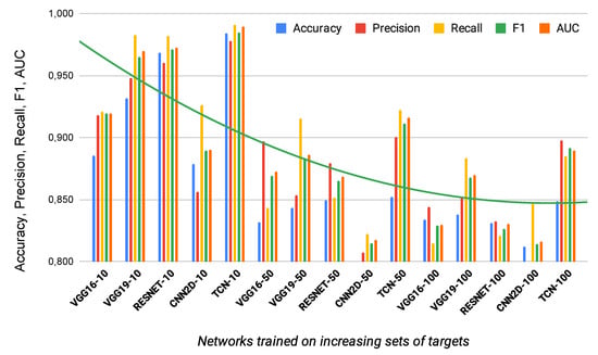 Table 4 also reports the performance of the TCN for different number of targets compared to the best standard classifiers. Specifically, we compared the proposed architecture with the state of the art models used for similar tasks (i.e., VGG16 and VGG19 [46], RESNET [47], and the standard CNN2D). The table shows that in all the cases the TCN gives best F1 and AUC.