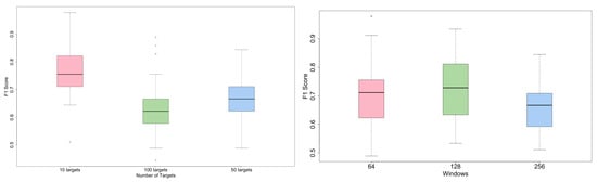 Finally, Figure 9 (left side) show the different F1 scores of the TCN classifiers by the changing targets numbers. Similarly, the figure (right side) also shows that the best F1 score is generally obtained for the window size of 128. The figure confirms and generalizes the above considerations.