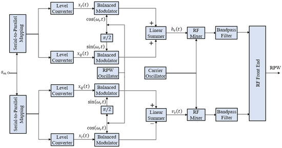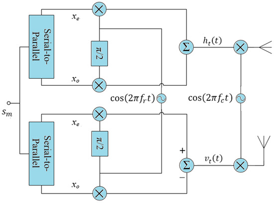 RPW is made feasible by equipping the transmitter in Figure 3 with two baseband PSK modulators of frequency , but orthogonal to each other for horizontal and vertical polarizations. A data symbol is simultaneously input to both modulators to generate and , where the subscript t corresponds to transmitted signal.