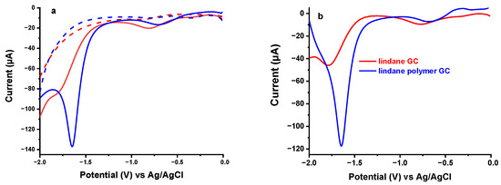 Square wave voltammogram in the absence (broken) and presence (solid) of lindane in 0.2 M KCl solution at bare (red) and polymer modified (blue) glassy carbon electrode (a) and background corrected response at bare (red) and polymer modified (blue) electrode (b). SWV conditions: Estep = 0.01 V; Amplitude = 0.1 V; Frequency = 15.0 Hz.