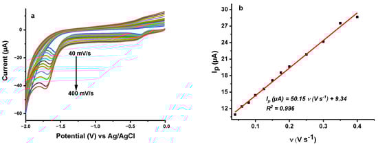 Cyclic voltammograms of 100 µM lindane were recorded in 0.2 M KCl solution with different scan rates to investigate the reduction kinetics at the polymer modified electrode (Figure 4). The study was made between 40 and 400 mV s−1 and the peak current at ~−1.6 V was plotted against the scan rate and square root of scan rate, respectively, which the plots yield the linear regression equations: Ip (µA) = 50.14 ν (V s−1) + 9.34 (R2 = 0.996) and Ip (µA) = 42.19 ν1/2 (V1/2 s−1/2) + 1.35(R2 = 0.986). These results depict that the kinetics of lindane reduction at the modified electrode has contributions from both adsorption and diffusion processes [25]. However, the plot of the log peak current (µA) against log scan rate (V s−1) also followed a linear relation according to the equation: log Ip (µA) = 0.433 log ν (V s−1) + 1.608 (R2 = 0.978), with a slope of 0.433 close to 0.5 a theoretical value for a purely diffusion-controlled process, indicating the dominant effect of diffusion in the reduction process [26]. Additionally, a shift in the reduction peak to more negative potential is observed from the plot of Ep vs log scan rate following an equation: Ep (V) = 0.140 log ν (V s−1) + 1.772 (R2 = 0.992) which confirms the complete irreversibility of the reduction process.