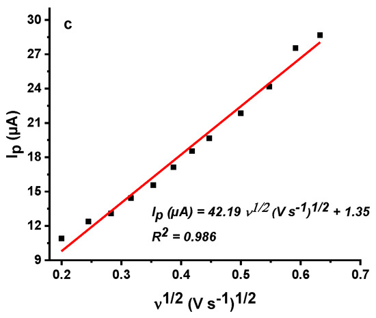 (a) cyclic voltammograms of 100 µM lindane using different scan rates in 0.2 M KCl solution and reduction peak currents extracted from the voltammograms plotted against the scan rates (b) and against the square root of scan rates (c).