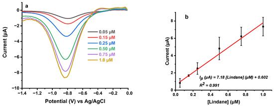 Square wave voltammograms between 0.0 to −1.4 V were recorded to quantify lindane in the concentration range from 0.05 to 1.0 µM in 0.2 M KCl solution (Figure 5a). The background measurement was recorded in 0.2 M KCl and then a series of lindane standards were spiked to the solution, stirred thoroughly and measurements were performed. The background corrected voltammograms Figure 5a and the mean peak currents extracted from three independent calibration measurements together with standard deviation used as error bars were plotted (Figure 5b). Figure 5b shows that the peak current is linearly proportional to the lindane concentration with the sensitivity of 7.18 µA/µM. The linear regression equation of the plot was: Ip (µA) = 7.18 [lindane] (µM) + 0.602 (R2 = 0.991).