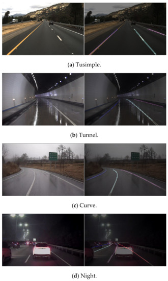 We chose four indices to verify the performance of the lane detection model, which were accuracy, precision, and recall. The equation of accuracy is Formula (4). Precision’s [10] and recall’s [10] equations are as follows: