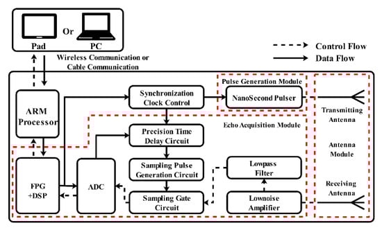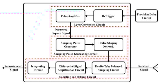 The study of IR-UWB through-wall radar system began around 1980, more than 40 years ago. Generally speaking, the hardware of IR-UWB through-wall radar systems is more concise than that of other through-wall radar solutions, like FMCW and SFCW through-wall radar [], which consist of three parts: an impulse signal generation module, an echo signal acquisition module, and a data processing communication module. The corresponding system block diagram is shown in Figure 1. The design of the impulse signal generation module focuses on an all-solid state with high stability and a high repetition rate. This design can be implemented by using a field effect transistor (FET) or step recovery diode (SRD) as the core components. Because the impulse signal needs a high-speed analog-digital converter (ADC) for sampling, it is not conductive to radar system engineering implementations. As the transmitted signal is a periodic repetitive signal, the design scheme of the echo signal acquisition module based on equivalent sampling technology can be completed using a Field Programmable Gate Array (FPGA) and a low-rate analog-digital converter. The precision delay circuit is controlled by FPGA and generates the sequence delay square signal. This signal is processed by narrowing and amplifying it to force the sampling generation circuit to trigger the sampling gate circuit. Figure 2 provides more details about this module. The data processing communication module is responsible for the dual flow of data. When the detection data are transmitted to the module, users also can issue work instructions. Usually, the module uses a cable or wireless method (e.g., Wi-Fi, Zigbee, or Bluetooth) to interact with users.