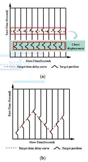 where and means the convolution operation. is the impulse signal transmitted by the radar transmitter. represents the signal amplitude factor. refers to the path ’s propagation delay at time from the transmitter to the receiver. Discretize (2) along both the slow-time direction and the fast-time direction (the slow-time represents the received pulse number and the fast-time represents the total sampling points that can be converted to distance []). The radar received signal matrix can then be obtained and some relevant information can be extracted (the specific method will be introduced in Section 5). Considering only one human target in the scene, we can solve the human position using TOA . Meanwhile, along the slow-time direction, the human target’s respiratory and heartbeat rates can be analyzed. Figure 3 illustrates the human signal model (in Figure 3b, we magnified the displacement of the chest cavity intentionally).