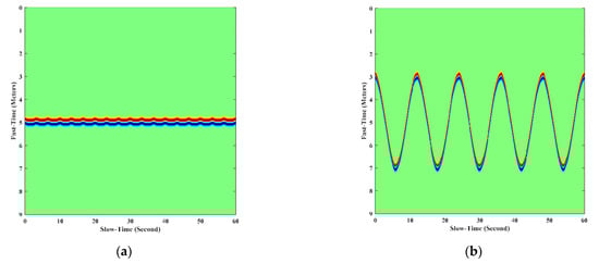 Based on the UWB radar received signal model (2), the return signal of a stationary human was simulated in []. In this paper, the return signal of a moving human was simulated. In these simulations, we used the following assumptions: The signal transmitted by the radar had no attenuation during propagation, and the transmitted signal was a Gaussian pulse. The transceiver antenna of the radar remained under ideal conditions. The human scatter only considered the torso and the displacement of the chest. The simulation scenarios were as follows. The human target was standing still with a simulated respiratory frequency of 0.3 Hz, and his/her chest displacement was 0.05 m. The moving human was walking back and forth along the radar line of sight radially. The simulation running time was 60 s. Figure 4 shows the simulation signals.