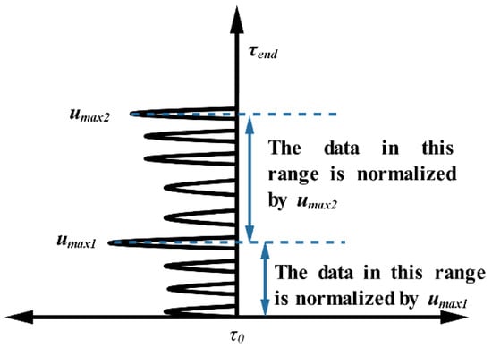 The method proposed in [] is called advanced normalization. Consider that the total interval of the received signal length is . First, the maximum value of the total interval is calculated, and its index position is recorded as ; then, the signal among is normalized based on . Second, the next largest value is found along the sub-interval of this signal and normalized in this interval. After reaching the index position at the end of the signal, the loop ends. This method is illustrated in Figure 5 with pseudo-code is shown in Algorithm 1.