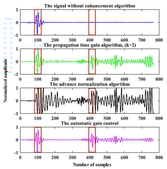 This algorithm clearly requires the input of two parameters (i.e., the sliding window and the max gain ), but the author doses not give any suggestions of how to select these two parameters. matGPR introduces similar signal-enhanced algorithms based on the application of GPR (e.g., standard AGC and Gaussian-tapered AGC) []. In matGPR, the time-varying signal level is computed by the signal root mean square (RMS) over a sliding time-window. During this time-window, the signal amplitude at the center of the window with respect to the RMS of the window scales. This process ensures that a low signal amplitude can be enhanced with respect to the high signal amplitude.