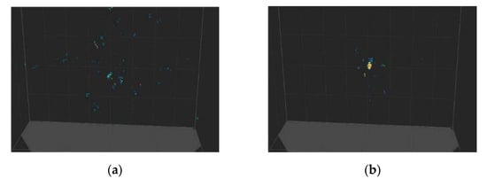 In an actual multi-channel through-wall radar system, the starting point of the echo signal is not the ‘zero time’ of radar. This is because the time delay of each piece of channel hardware is different and time-varying (due to temperature, voltage stability, and other physical parameters). To achieve the human localization of multi-channel radar, a zero-time search and time-delay calibration are required among the receiving channels. If not, the wrong position may be located or image defocusing may occur. Figure 8 presents a simple spherical object imaging result of XaverTM-800 with the time delay calibrated in different stages []. Figure 8 shows that time-delay calibration is significant for imaging results. In Figure 8a, the imaging result is defocused and cannot be considered as a spherical target.