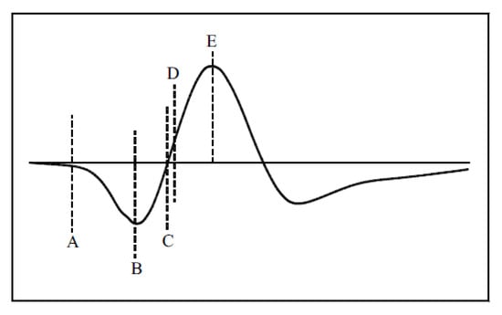 The work in [] summarized its zero-time position findings, including (1) the first break point; (2) the first negative; (3) the zero amplitude point; (4) the mid-amplitude point; and (5) the first positive peak, as shown in Figure 9.