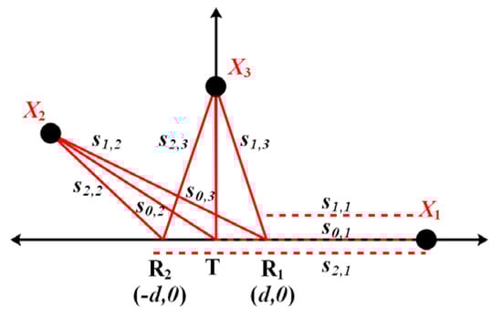 Assuming that there is no time delay in the channels, the first positive peak position can be calculated by (14), where is the propagation velocity of electromagnetic waves, and is the distance of the transmitting and receiving antenna. When considering the time delay in the channels, the direct coupling wave will appear delayed, and (14) should be rewritten as (15), where represents the time delay in the corresponding channel. Then, with these two equations, can be solved and used to calibrate the target position. The pseudo-code of the calibration method is shown in Algorithm 2.