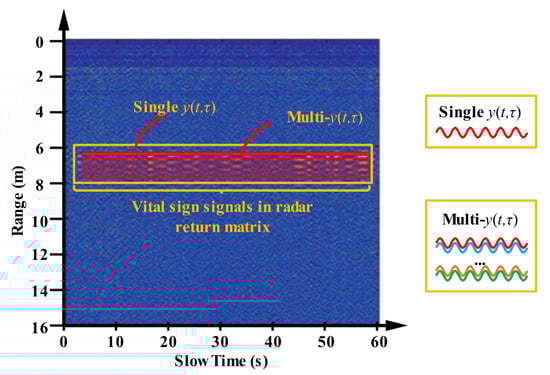 In past studies, many papers build models to describe human return signals. In Fei et al. [] the human target echo of a UWB through-wall radar was modeled in the time-domain. The received signal was complex and could not be understood by the simple delay and doppler frequency of the transmitting signal but required the superposition of different time delays of multiple scattering points of the whole target. After the first filter of the wall, the signal transmitted by the radar penetrated the wall and irradiated the target, then the radar wave penetrated the wall a second time and was received by the receiver together with other noises. A specular multipath model for UWB radar was introduced in [,]. The return signal included a multi-path component because the return wave came from different human body parts at different times with various amplitudes. These different scattering pathways should be considered as multipath components of the UWB radar’s received signal. Therefore, the time-varying UWB multipath channel model can be used to describe the human return signal []: