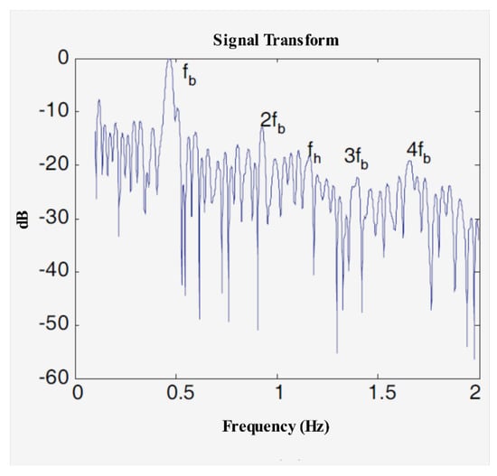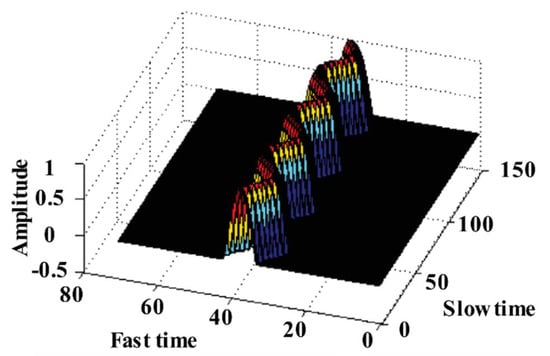 In the through-wall radar detection scene, the reflected signals of the target contain high-frequency components in the frequency domain. When the target maintains a large amplitude motion, the high-frequency component is greater. The pulse cancellation method has the function of a high pass filter in the frequency domain; therefore, this method can remove clutter to some extent. Here, , represents the radar received signal at , time. Then, the human reflected echoes can be expressed as