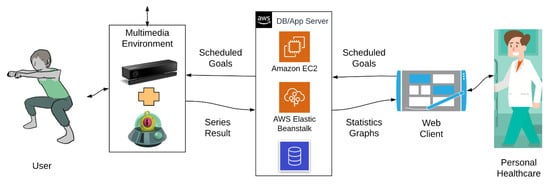 Figure 1 illustrates KineActiv’s main workflows, where a gamified user interface based on Augmented Reality (AR) is connected to a distributed system with a central server and a database. A web-based application is used by the physiotherapist to prescribe treatments and to monitor the user’s progress. The gamified environment is intended to make the rehabilitation process more friendly and enjoyable, using specific gamified contexts for each type of exercise.