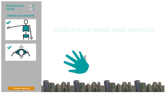 Taking advantage of the many opportunities that Kinect V2 offers to recognize human motion, a rule-based approach has been developed to recognize a simple and natural gesture that allows the user to interact with the system. In particular, a rule to recognize the movement of the hand from left to right and from right to left has been implemented, with the palm facing the sensor. Once the system recognizes this gesture, it automatically changes to the next screen. For example, this action would allow starting a game linked to the selected exercise.